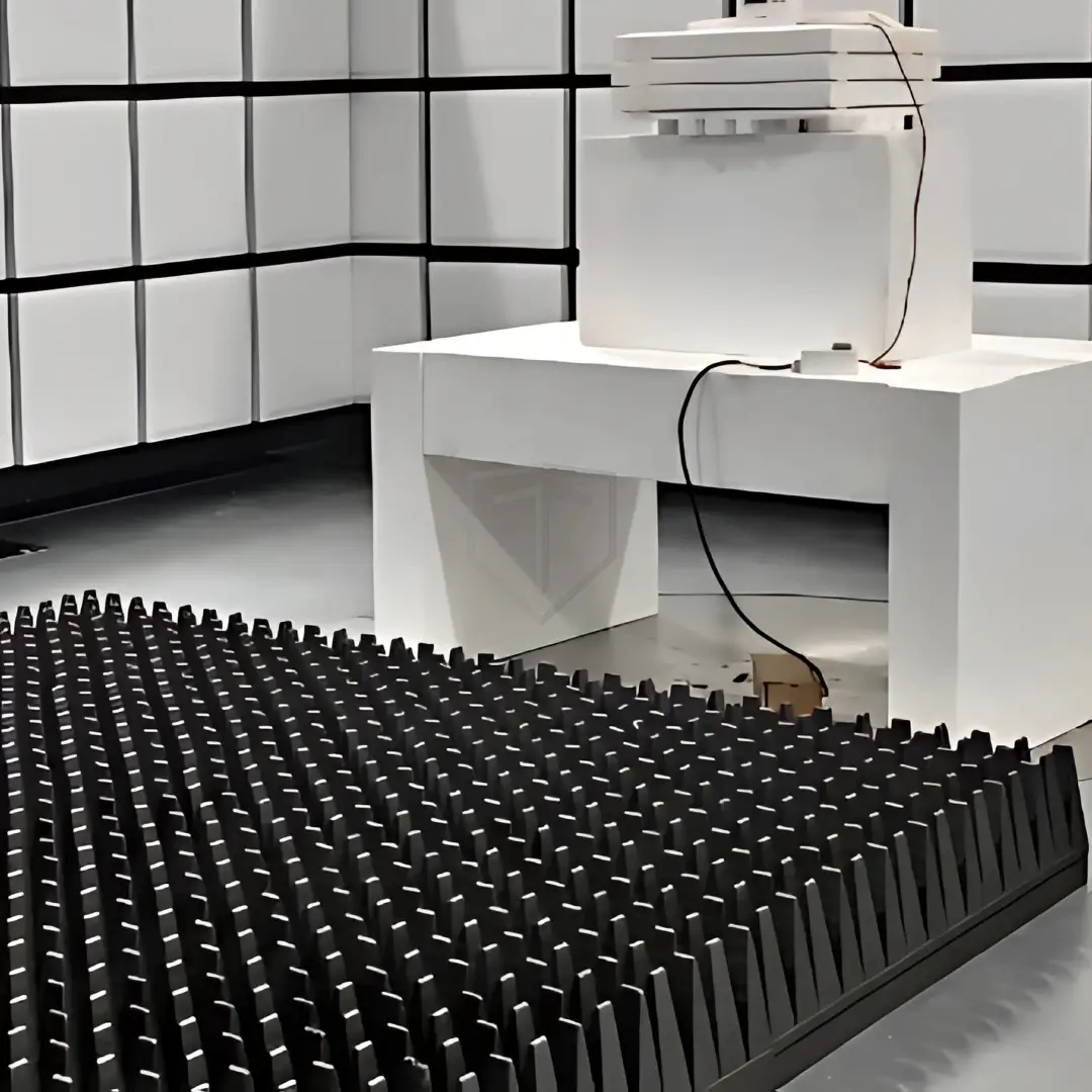 Ferrite Tiles & Absorbers – The walls and ceiling of the test chamber are meticulously outfitted with cutting-edge gapless Hybrid Pyramid absorbers and Ferrite tiles. These Pyramidal absorbers are carefully engineered to facilitate a seamless transition from the exceptional performance of the Ferrite tiles at lower frequencies to the Pyramidal absorbers at higher frequencies.